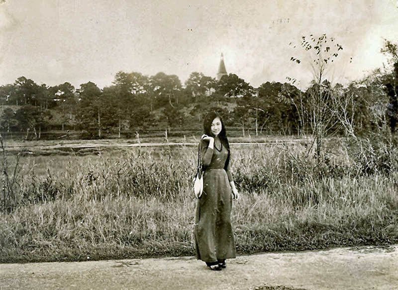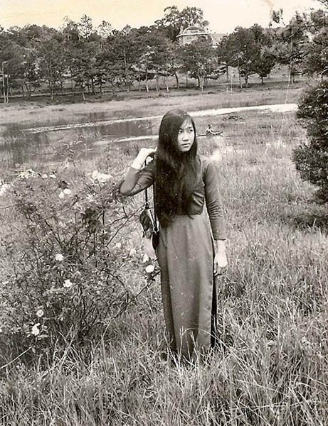 De gauche à droite : Marie-France Bartoli (jupe plissée), Dương Minh Diệu (áo dài) et son chaperon