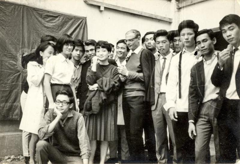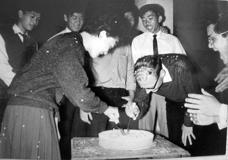 Thuc et Jean-Pierre Blaize (prof de Français) coupent le gâteau, sous le regard de Huynh Van Thông, Trân Thanh Binh, Tran Phung Châu, Ngo Quoc Trung, Sarandas